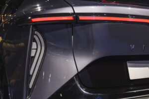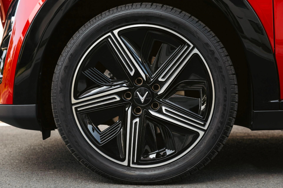 - Thiết kế: VF7 nổi bật với dải đèn LED hình cánh chim ở cả đầu và đuôi xe – đặc trưng của VinFast. Mui xe vuốt coupe thể thao, kết hợp cùng la-zăng hợp kim 19 inch (Eco) hoặc 20 inch (Plus).